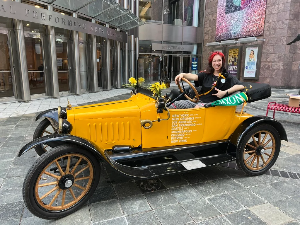 Suffs cast member Marissa Hecker spots the Golden Flyer II climbed in, took photos, and pledged to spread the word to her castmates. When the show about Alice Paul meets the car retracing Alice and Nell's journey, magic happens on the sidewalk. Photo: Nina Zacuto