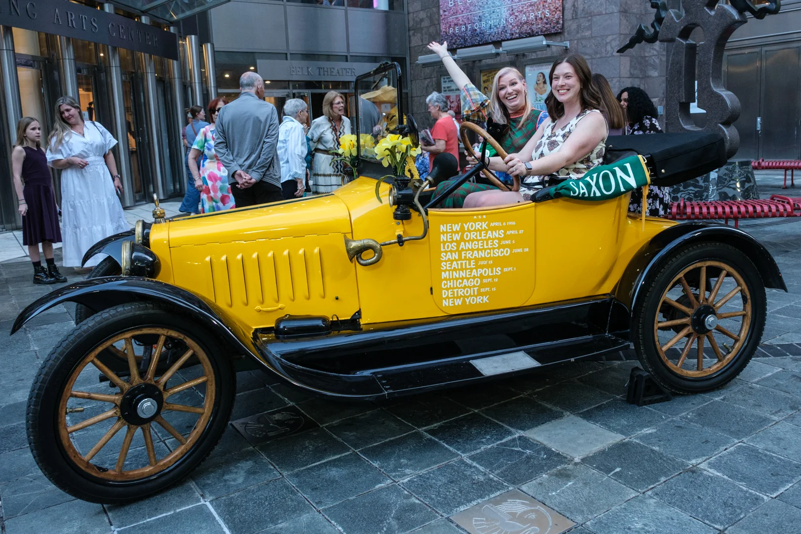 And then something wonderful happened. Suffs cast member Marissa Hecker spots Jeryl Schriever — and the Golden Flyer II — outside the Belk Theatre and stops for a closer look. She recognized Jeryl's green hat from the front row the night before. She climbed in, took photos, and pledged to spread the word to her castmates.