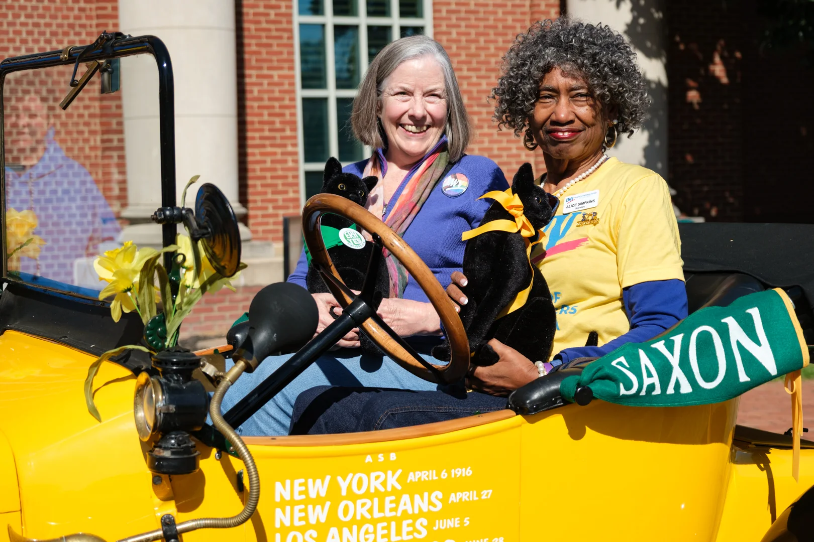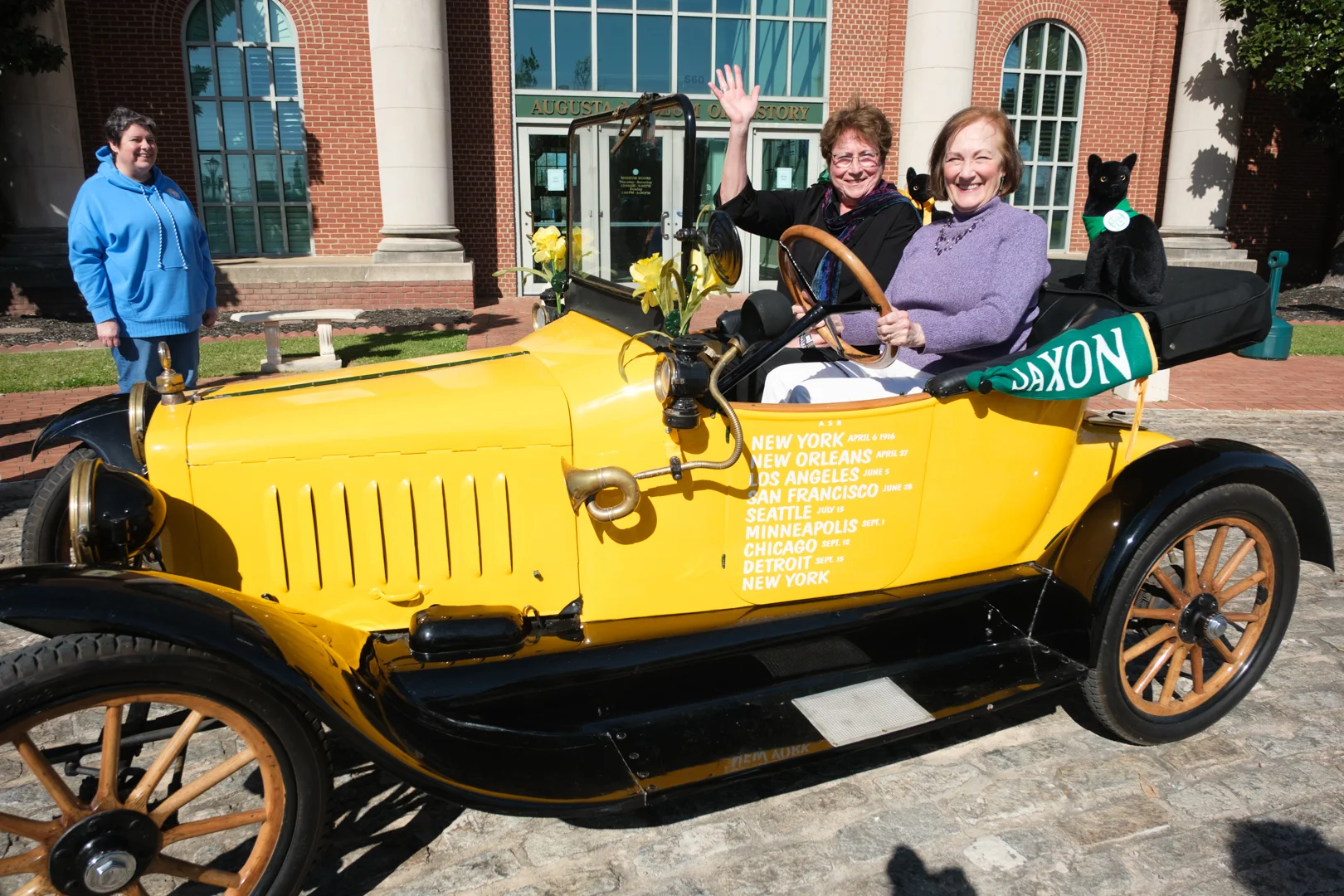 Augusta Museum of History Executive Director Nancy Glazer and Dr. Lee Ann Caldwell, Professor and Director for the Study of Georgia History at Augusta University, get a hands-on taste of the 1916 suffrage journey — the woman who opened the museum doors and the scholar who put the history in context, united in the driver's seat. Photo: Nina Zacuto