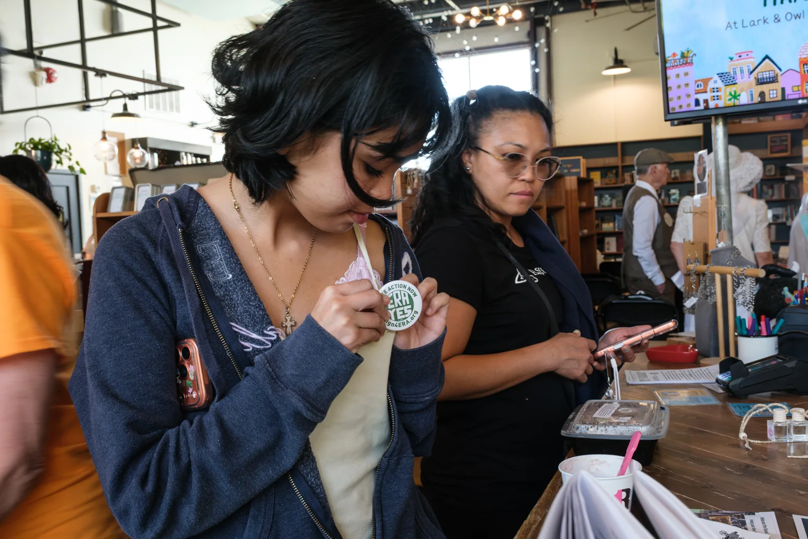 A young woman pins on her Sign4ERA.org button at Lark & Owl Booksellers after learning the ERA is stalled and adding her name to the petition — because knowing the truth has a way of turning bystanders into advocates. Photo: Nina Zacuto