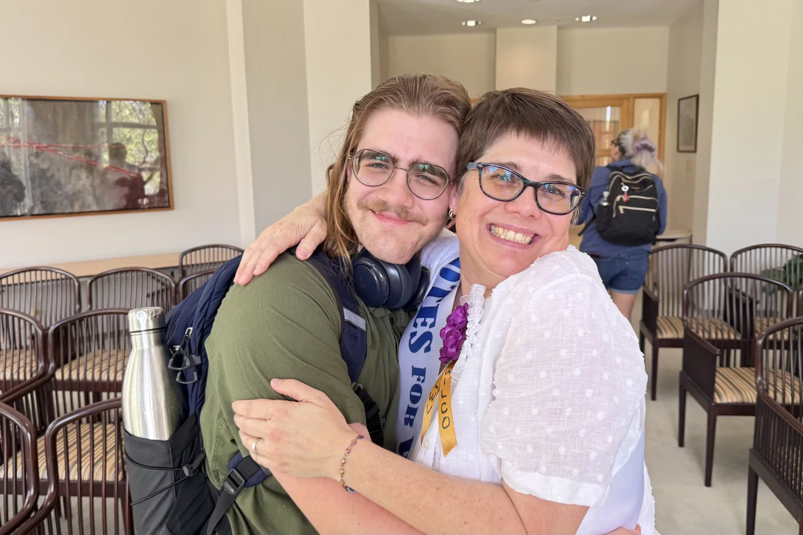 Felicia Miyakawa, President of the League of Women Voters of Williamson County, and her son Lucien Tannenhill-Miyakawa — government major, campus voter registration organizer, and member of SU Votes — share a proud moment after the ERA panel discussion at the Smith Library Center. Two generations, one cause, one very big hug. Photo: Nina Zacuto
