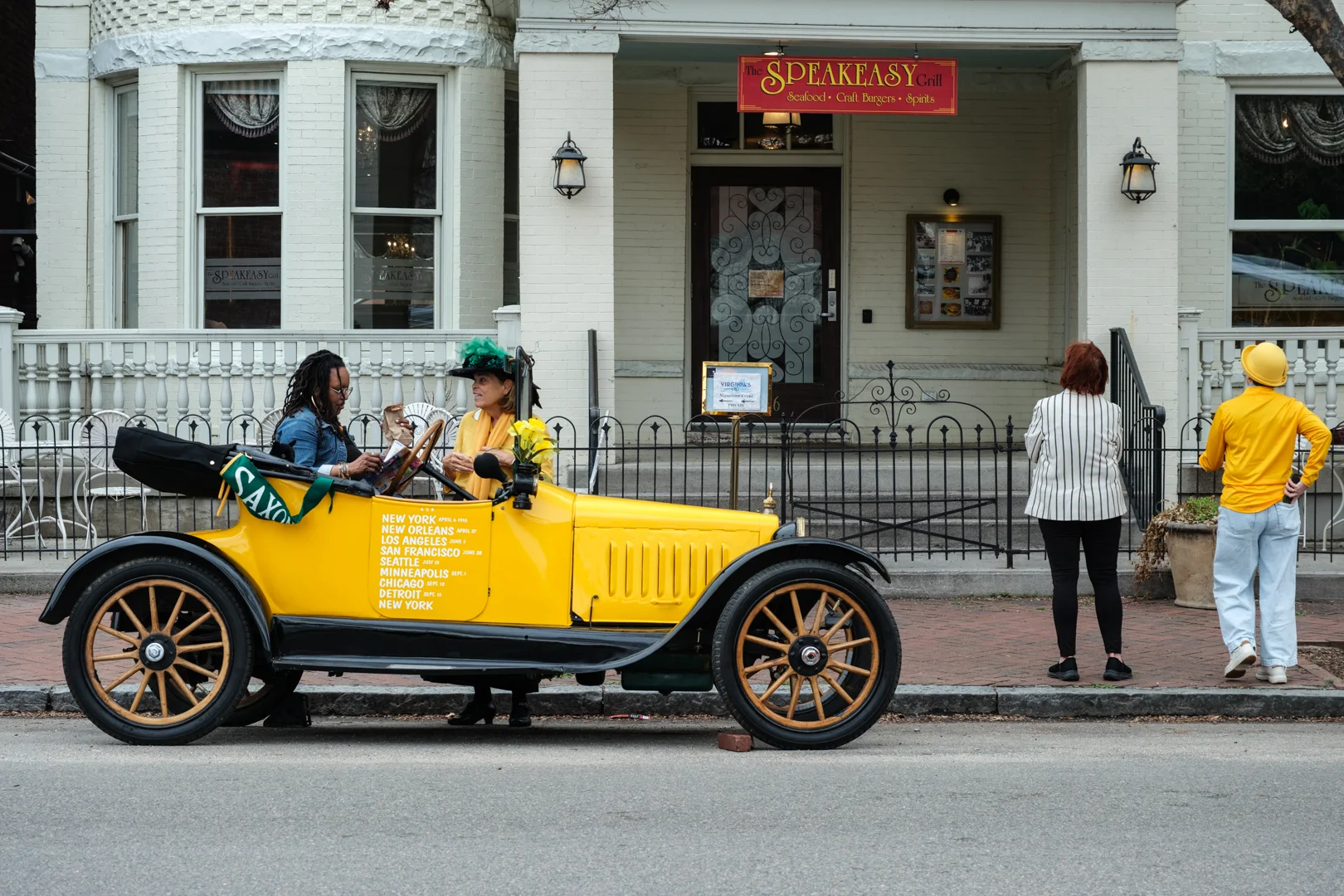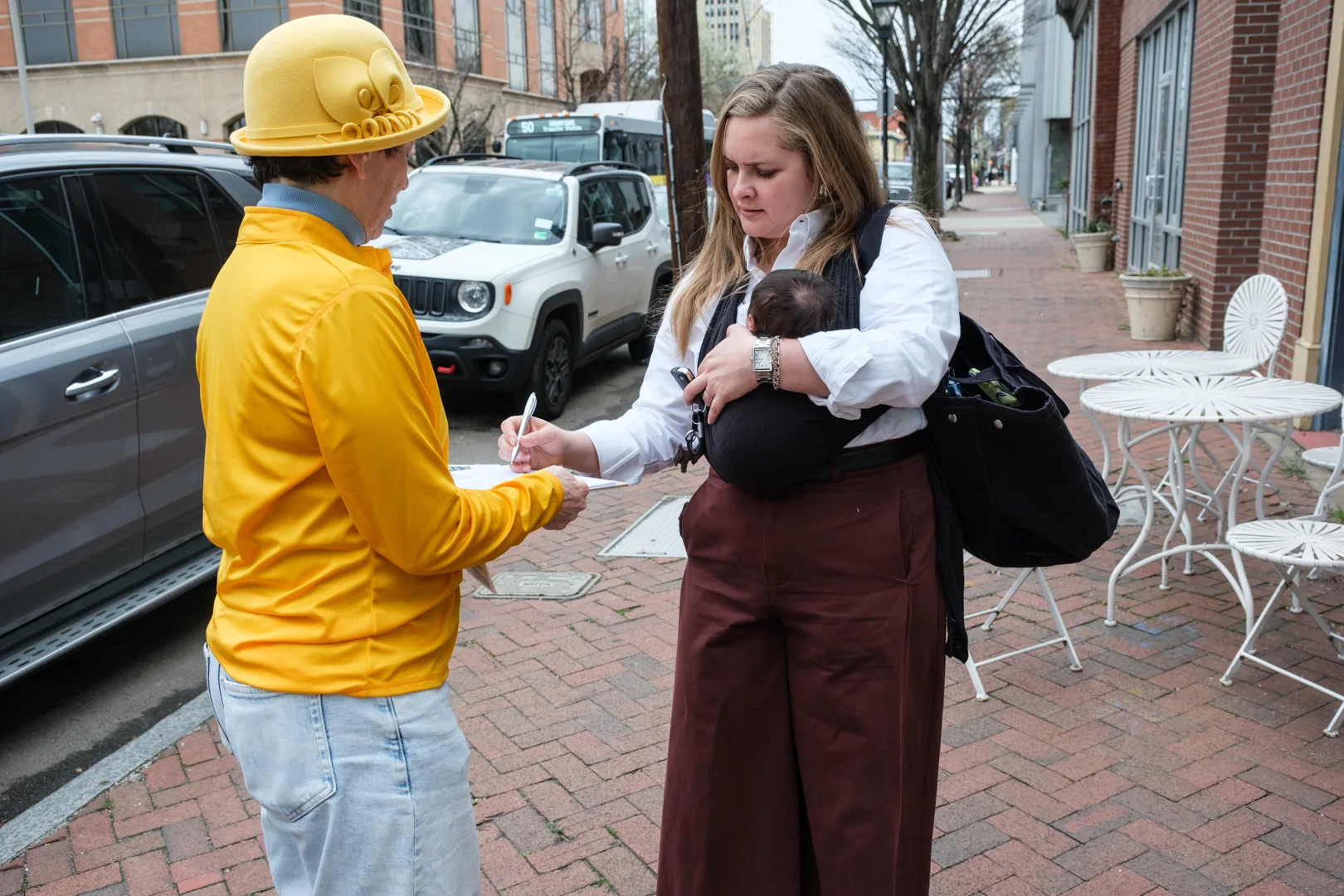 A passerby gets a front-row seat to history — literally — as Jeryl Schriever describes Alice and Nell's 1916 suffrage journey outside the Virginia's List event behind the Speakeasy Grill. The Golden Flyer II has a way of turning curious strangers into ERA supporters. Photo: Nina Zacuto