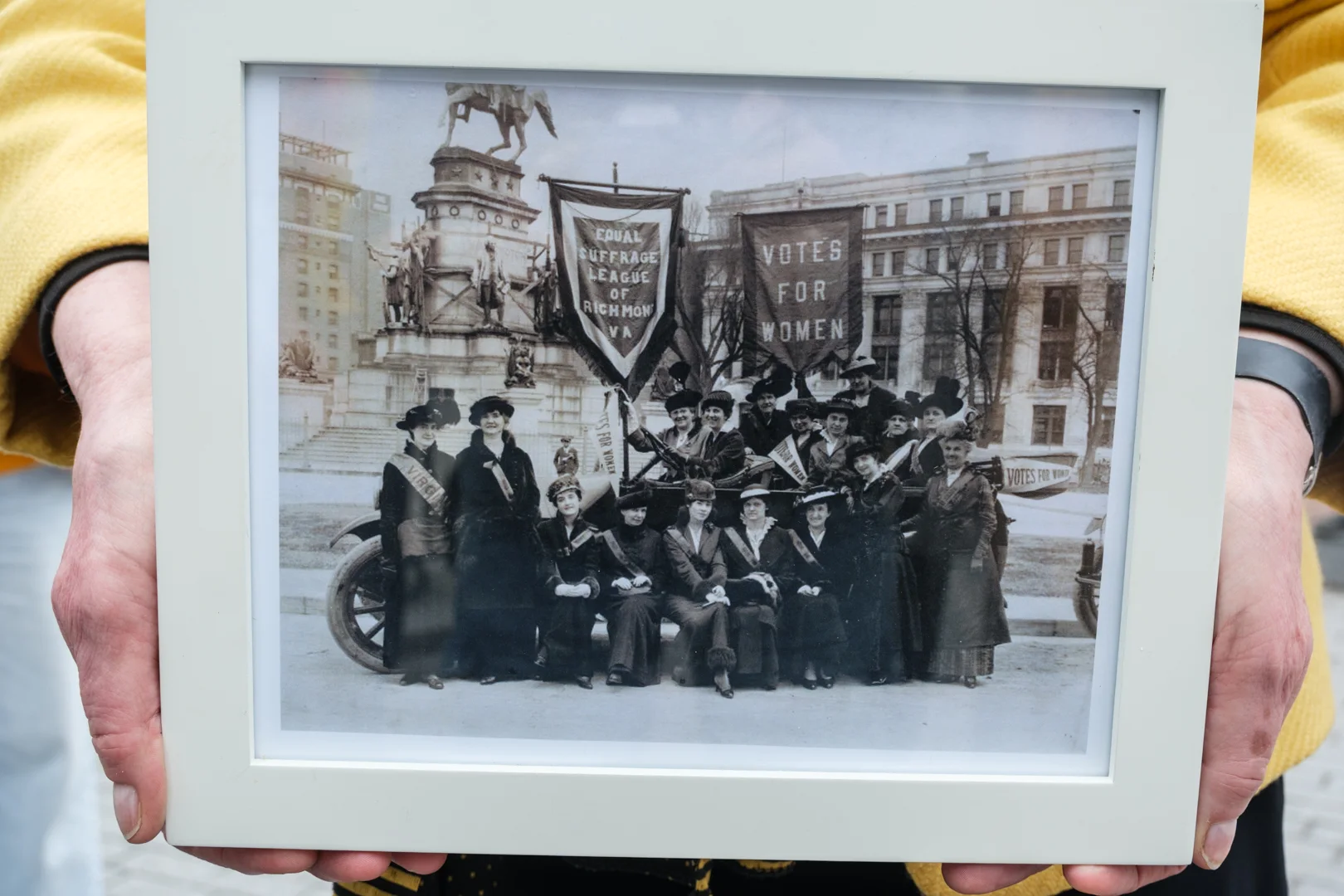 At the Bell Tower, she held up a photograph. It was taken in the early 1900s — seventeen suffragists of the Equal Suffrage League of Virginia, standing together in front of the George Washington Statue in Capitol Square, just steps away.