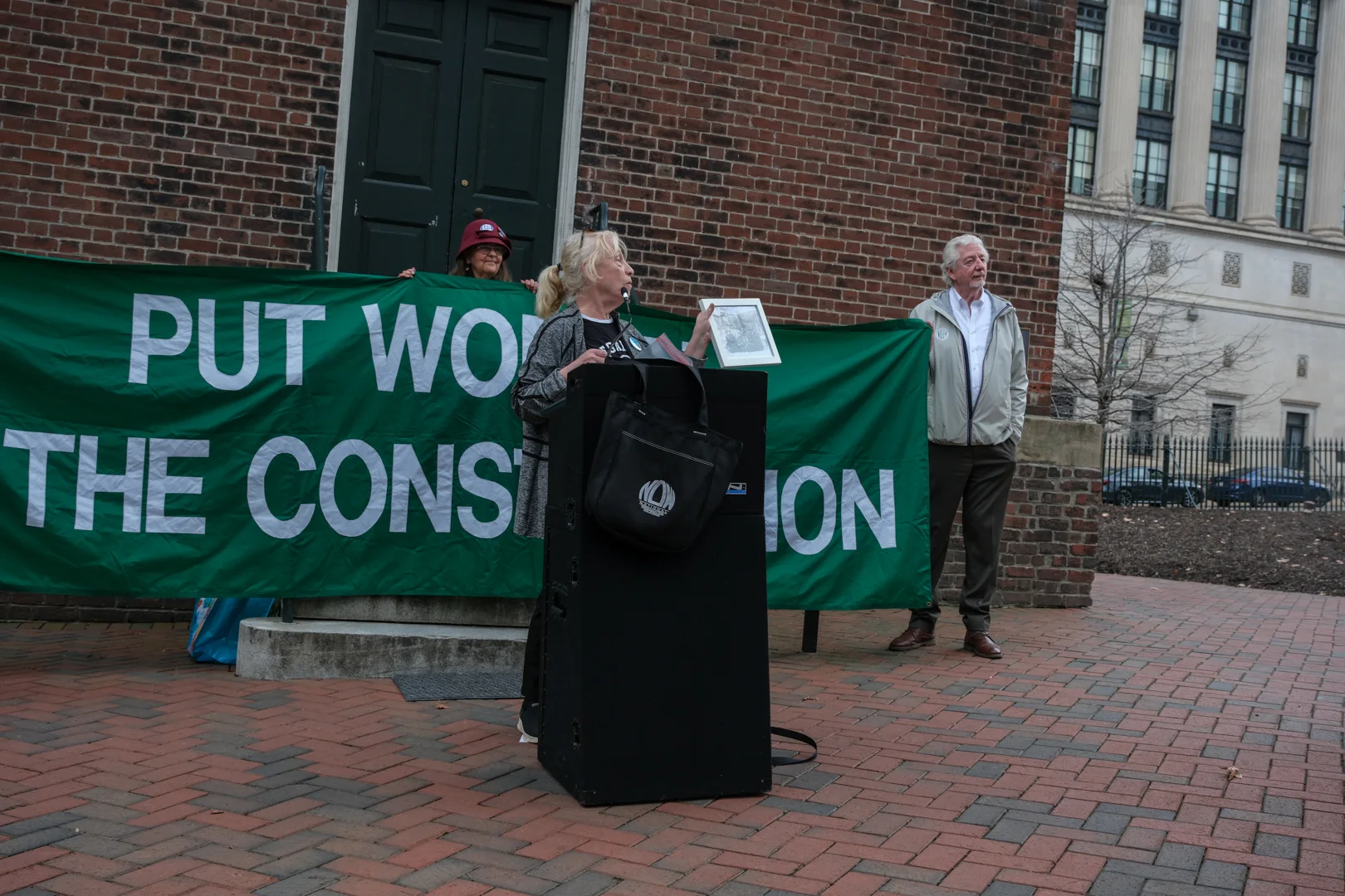 Virginia NOW President Kobby Hoffman opened the rally and introduced Virginia Delegate Amy Laufer, who served as master of ceremonies with grace and energy throughout. Jeryl Schriever spoke about Alice and Nell's 1916 journey, about the Saxon, about the book, and about why 2026 is the year this movement closes the distance between ratification and recognition.