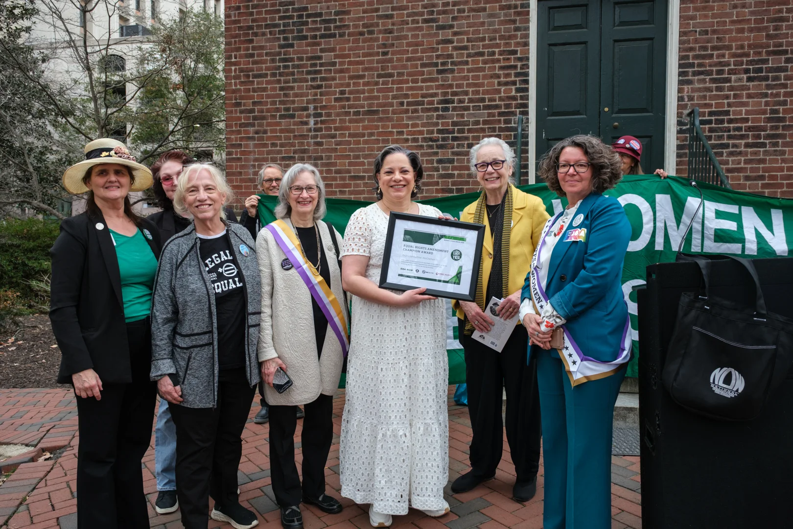 Representative Jennifer McClellan holds her ERA Champion Certificate — awarded jointly by ERA NOW, the National Organization for Women, the ERA Coalition, and the Feminist Majority Foundation — in recognition of her leadership on the Congressional Joint Resolution to affirm the ERA as the 28th Amendment. Front row, left to right: Kobby Hoffman, President of Virginia NOW; Eileen Davis, nurse, activist, and mother of Governor Abigail Spanberger; Charlotte Gibson, President of Charlottesville NOW; Kathy Bonk, ERA NOW; and Virginia Delegate Amy Laufer. Five decades of ERA organizing in one photograph. Photo: Nina Zacuto