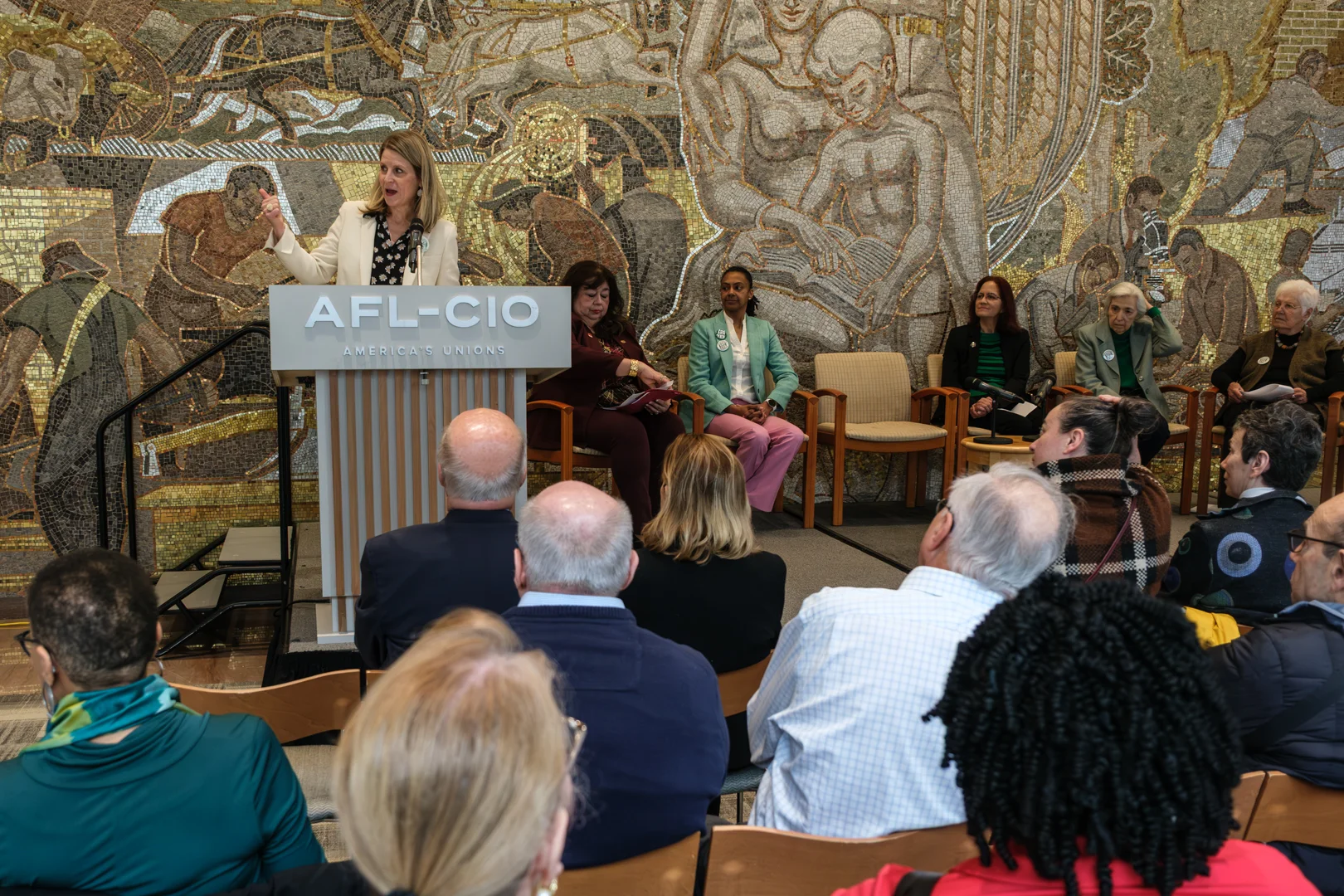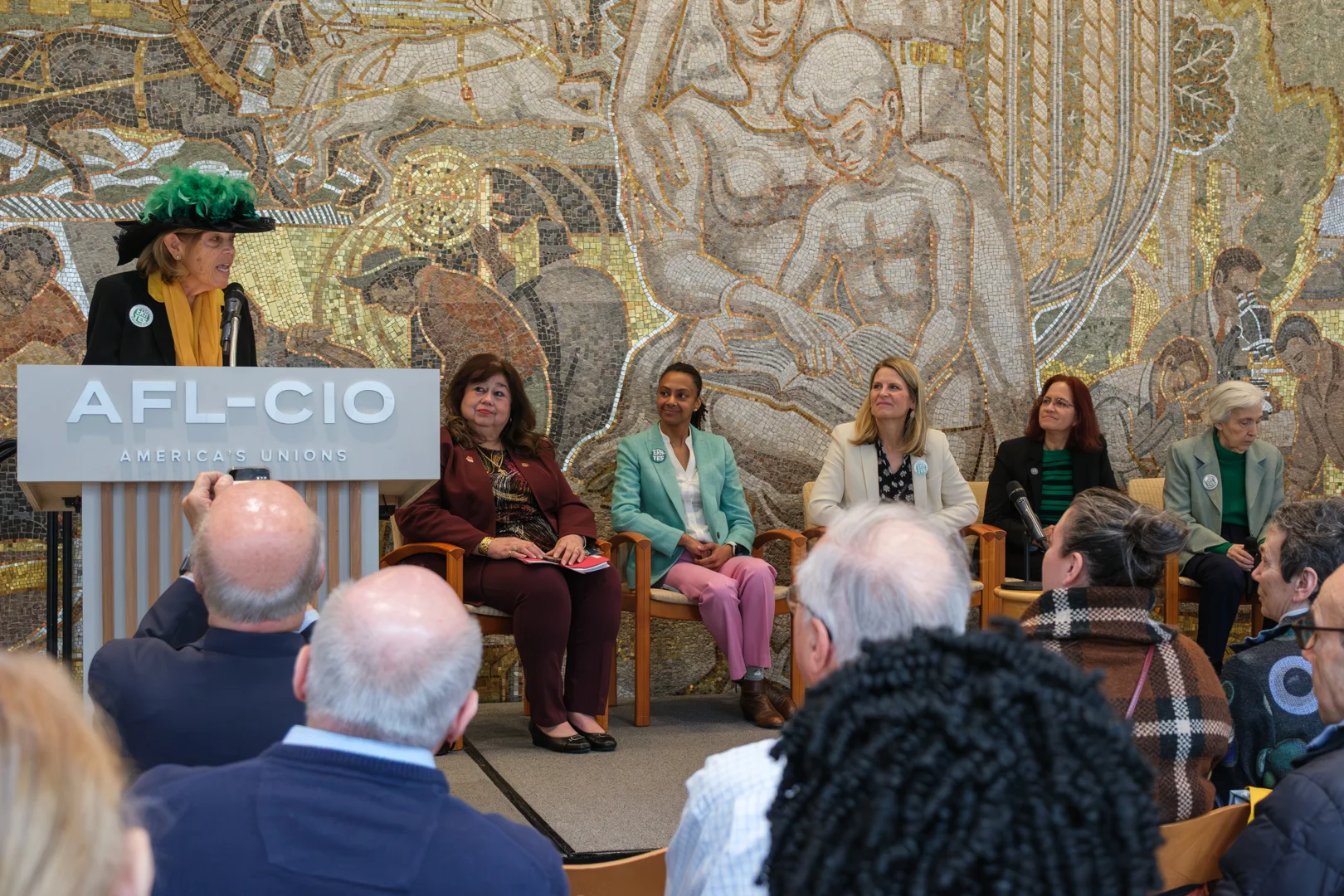 Kim Villanueva, President of NOW, and Ellie Smeal together honored Dorothy Haener — a welder during World War II who fought within the United Auto Workers for equal pay and against workplace harassment decades before those words entered the mainstream. Haener was, they said, a bridge builder between the labor movement and the feminist movement. Standing in the AFL-CIO in 2026, you could feel that bridge holding.