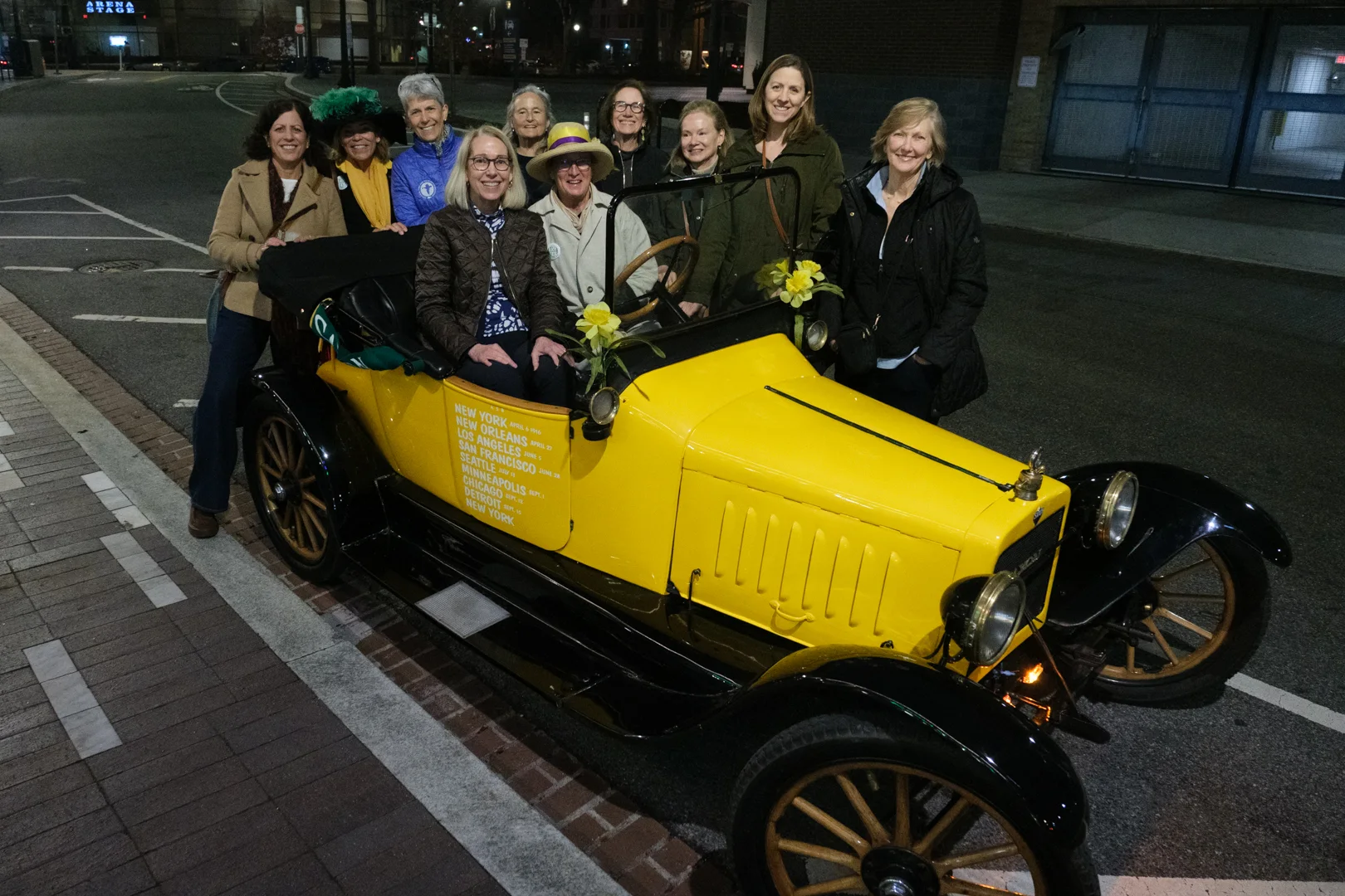 Inside, Jeryl Schriever — author of Driving the Vote for Women and the woman who has spent years recovering Alice and Nell's nearly forgotten story — told the crowd about the 1916 journey. About two women who climbed into a small golden Saxon roadster with no highways, no guarantees, and a cause that everyone told them would never succeed. About the speeches they gave in snowstorms. About the crowds that cheered and the ones that didn't. About why the story matters now more than it ever has.